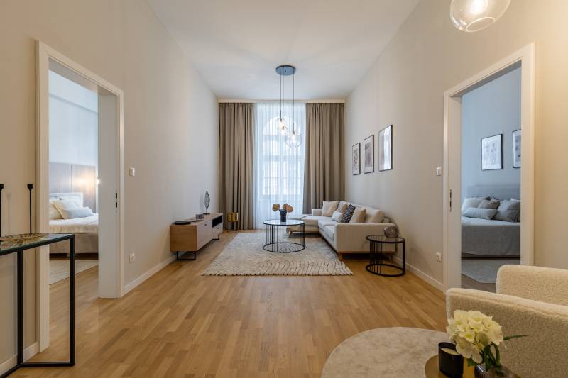 A klasszikus terek és a modern kényelem harmóniája. Üdv itthon!RÖVID ÖSSZEFOGLALÓBudapest V. kerületében, Hild tér mellett, a méltán kedvelt Október 6. utcában, 1845-ban épült, lift nélküli, kívül jó, belül átlagos, a lépcsőház pedig átlagon aluli állapotú társasház 2. emeletén, 102 m² alapterületű,utcára néző, nappali + 3 hálószobás, 2 fürdőszobás, kiváló állapotú, azonnal költözhető lakás. Ízléses, hangulatos, igazi otthon.LOKÁCIÓ – A város középpontjábanA múltat idéző, építészeti remekművek adta környezet a város lüktető szíve. Éttermek, kávézók, üzletek sokasága várja az itt élőket. Egyszerre kínál kulturális gazdagságot, kényelmet és inspiráló városi életérzést. A Duna-part, Szabadság tér, Erzsébet tér, Deák Ferenc tér, Bazilika 2 perc sétatávolságon belül.Benn vagyunk a központban mindenhez közel. Mindig tudunk magunknak izgalmas programot találni:- esti séta a Duna-parton- borbár a barátokkal- színház a kedvesünkkel- shoppingolás- kávé valamelyik helyi kávézóban- reggeli brunch az ArtizánbanA sort hosszasan lehetne folytatni.A kiváló elhelyezkedéséhez nem fér kétség, a kényelmes, biztonságos környezet garantált!AZ ÉPÜLET – Történelmi érték, rendezett miliőA XIX. század közepén épült társasház a klasszikus belvárosi polgári építészet egyik ékes példája. A homlokzat méltóságot sugároz, a tágas belső udvar hangulatos atmoszférát teremt, a lépcsőház pedig őrzi a korabeli építészeti részleteket. Bár lift nem található benne, a második emeleti elhelyezkedés könnyedén megközelíthető, ami tovább erősíti a klasszikus polgári jelleg autentikus hangulatát.Parkolni a környező utcákban (fizetős övezet) vagy bérléssel lehetséges.LAKÁS – Kortárs elegancia polgári alapokonA lakás teljes felújítása során a polgári szerkezet nagyvonalú arányait ötvözték a modern otthonok kényelmével és kifinomult esztétikájával. A nappali világos, tágas tér, amelyet a nagyméretű ablakokon át beáradó fény és a visszafogott színek harmóniája tesz különlegessé. A konyha elegáns fekete és natúr fa kombinációban készült, beépített gépekkel és rejtett világítással, amely egyszerre esztétikus és funkcionális. A három különnyíló hálószoba neutrális tónusokkal és természetes fa padlóval biztosít nyugodt, kiegyensúlyozott atmoszférát. A két fürdőszoba olasz burkolatokkal, modern szaniterekkel és LED-világítással készült – egyik káddal, másik walk-in zuhannyal, a legmagasabb komfortérzetet kínálva.MIÉRT KÜLÖNLEGES? Az utcára néző ablakokból minden nap a belváros gazdagon díszített homlokzatai tárulnak fel. Ez a látvány folyamatos párbeszédet teremt a lakás modern, letisztult belső világával: a klasszikus polgári építészet részletei és a kortárs design tiszta vonalai együttese ad különleges élményt, amely egyszerre idézi meg a múlt értékeit és a jelen kifinomultságát.MEGHÍVÓEz a 102 m²-es belvárosi lakás a klasszikus polgári hangulat és a modern elegancia tökéletes egysége. Egy olyan otthon, amely a város közepén biztosítja a kifinomult életteret, időtálló értéket képvisel és méltó választás mindazok számára, akik a belváros legjobb adottságait keresik.----------------------------------Díjmentes, bankfüggetlen hiteltanácsadással támogatjuk vevő ügyfeleinket a számukra legelőnyösebb finanszírozási döntések meghozatalában. Opcionálisan igénybe vehető kiegészítő szolgáltatásainkkal – mint ügyvédi közreműködés, energetikai tanúsítvány vagy villamos biztonsági felülvizsgálat – teljes körű szakmai támogatást nyújtunk az adásvétel folyamatának minden egyes lépésénél.A hirdetésben szereplő információk tájékoztató jellegűek. A tévedés és az árváltoztatás jogát fenntartjuk. Az esetleges elírásokért és technikai hibákért felelősséget nem vállalunk.Spacious Period Apartment in the Heart of DowntownWhere classical proportions meet modern comfort. Welcome home!SHORT OVERVIEWFor sale in Budapest’s 5th district, next to Hild Square, on the highly sought-after Október 6. Street: a 102 m² apartment located on the 2nd floor of a classic, 1845-built residential building (no elevator).The building’s exterior is in good condition, while the staircase and common areas are average to below average.The property itself is in excellent condition and ready to move into.It features a spacious living room, three separate bedrooms, two bathrooms, and street-facing windows.Elegant, warm, and truly feels like home.LOCATION – In the Heart of the CityA neighbourhood that captures the essence of historic Budapest — surrounded by architectural masterpieces, vibrant city life, and a rich cultural scene.Cafés, restaurants, and boutiques are just around the corner, offering both comfort and inspiration for urban living.The Danube River, Szabadság Square, Erzsébet Square, Deák Ferenc Square, and the Basilica are all within a 2-minute walk.Living here means being at the centre of everything — with endless possibilities just steps away:An evening stroll along the DanubeWine bar with friendsTheatre night with your loved oneA bit of shoppingCoffee at a local caféBrunch at Artizán Bakery…and the list goes on.The location speaks for itself: a safe, convenient, and elegant environment in one of the most desirable parts of the city.THE BUILDING – Historic Charm, Timeless AtmosphereBuilt in the mid-19th century, this classic townhouse is a fine example of downtown bourgeois architecture.The façade radiates dignity, the spacious inner courtyard creates a pleasant, intimate atmosphere, and the staircase retains original architectural details from the era.Although there is no lift, the second-floor location is easily accessible, preservin